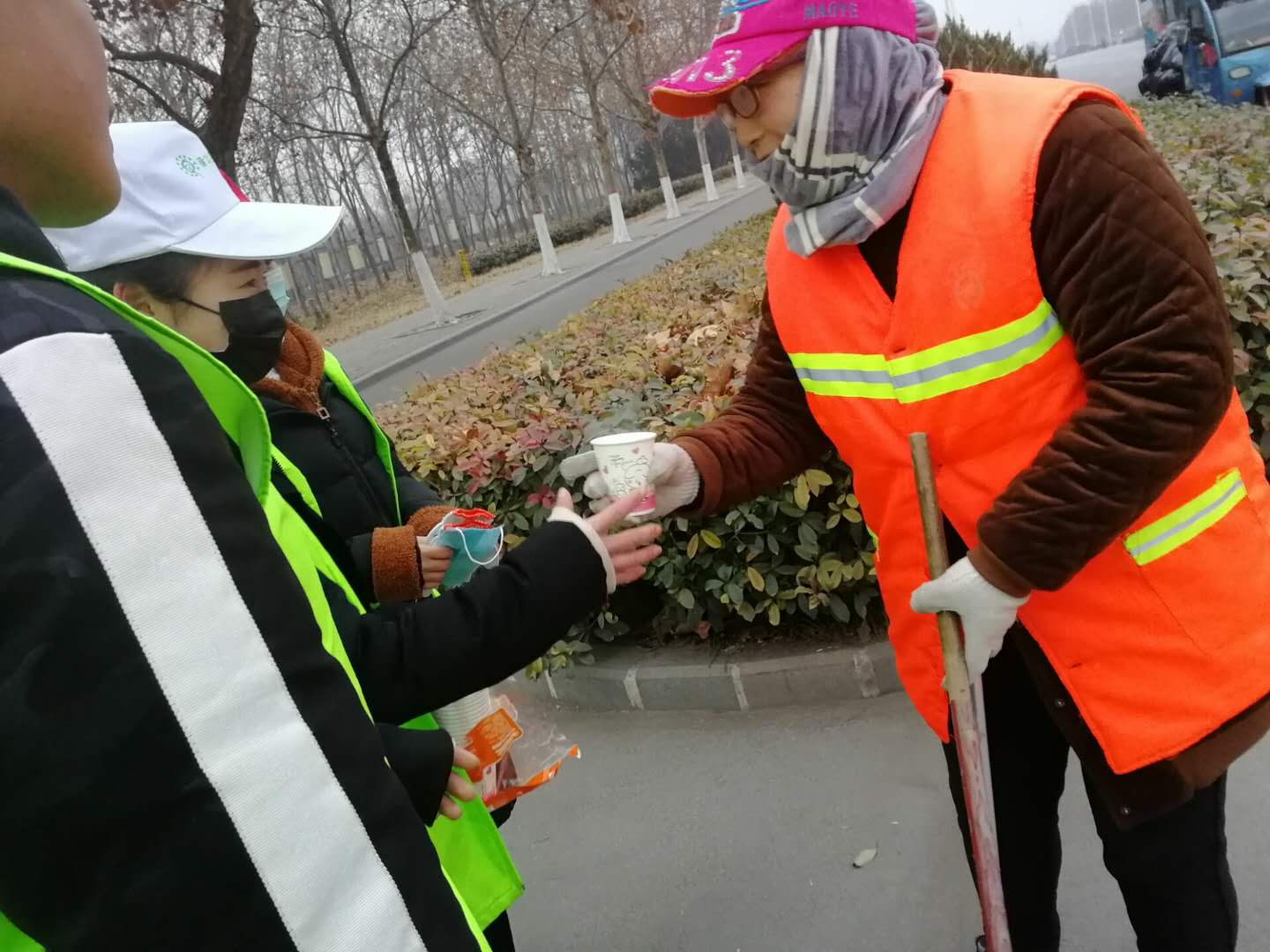 早上7点天微亮,志愿者们准时到达活动地点,帮助辛勤的环卫工人们打扫卫生,并亲手为环卫工人送上一杯热水,一双手套,一个口罩,让环卫工人们感受寒冷冬日里来自濮大学生志愿者们的浓浓温情和阵阵暖意。