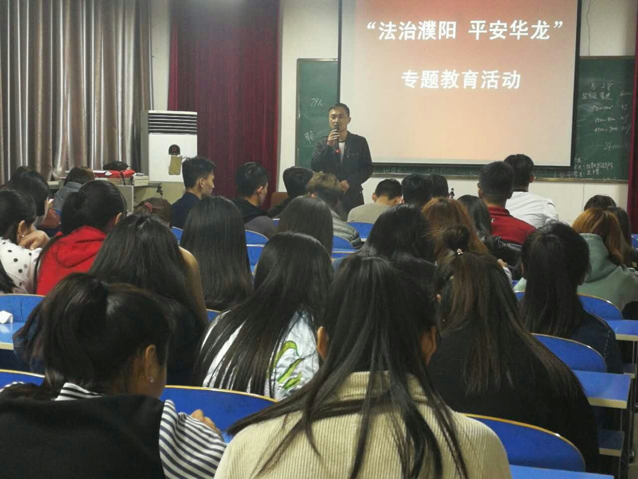 为开展法治宣传工作,建设平安校园,4月25日经济管理学院在504合堂教室举办了“法治濮阳 平安华龙”专题教育活动,2014级五年制全体学生参加本次专题教育活动。