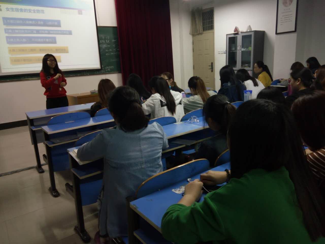 辅导员靳潇雨从消防安全,人身安全,财产安全,交通安全,食品安全等方面进行安全教育。强调防火、防贷、防诈骗。天气炎热一定要注意饮食安全,强调传染疾病的预防、发生和控制。关心自己,关心他人,对自己负责,对他人负责。安全意识,警钟长鸣。