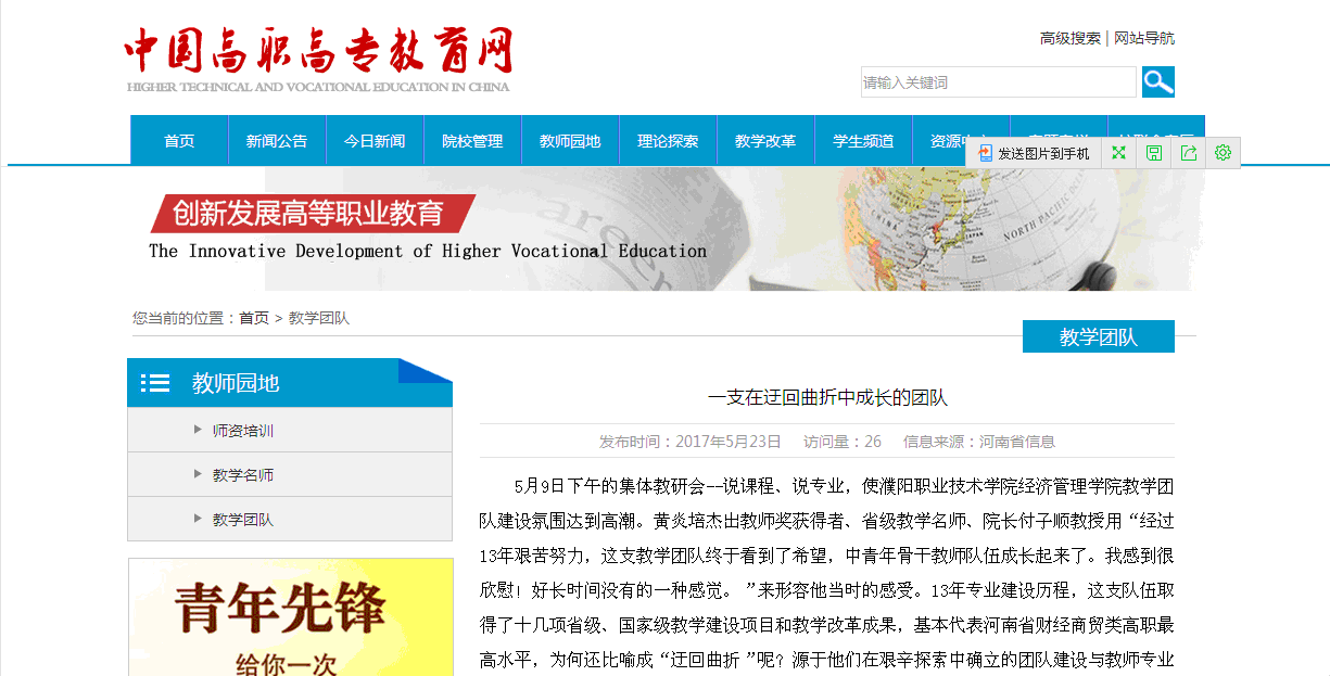,教育部举办的中国高职高专教育网“教师园地”专栏对我校经济管理学院付子顺教授撰写的《一支在迂回曲折中成长的团队》进行专题报道,向全国同行推介高职财经商贸类专业教学团队建设及教师专业化成长的成功经验。