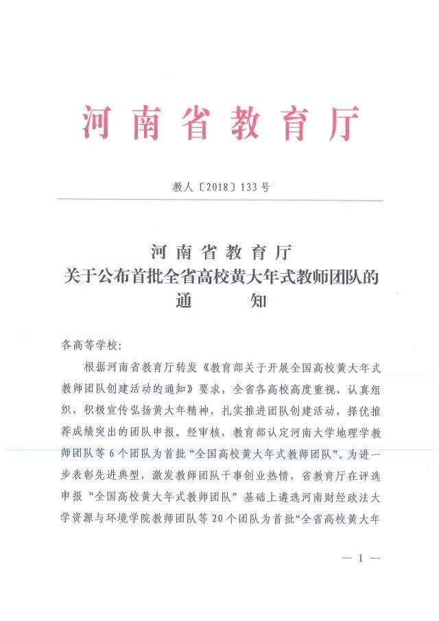 3月9日,河南省教育厅网站发布《关于公布首批全省高校黄大年式教师团队的通知》(教人〔2018〕133号),公布首批“全省高校黄大年式教师团队”名单,我省共有13所本科院校、7所高职院校获此殊荣,我校经济管理学院教师团队以全省高职院校第一名名列其中,这是经济管理学院继2013年获省级优秀教学团队后取得的第二个河南省省级优秀教学(教师)团队殊荣。